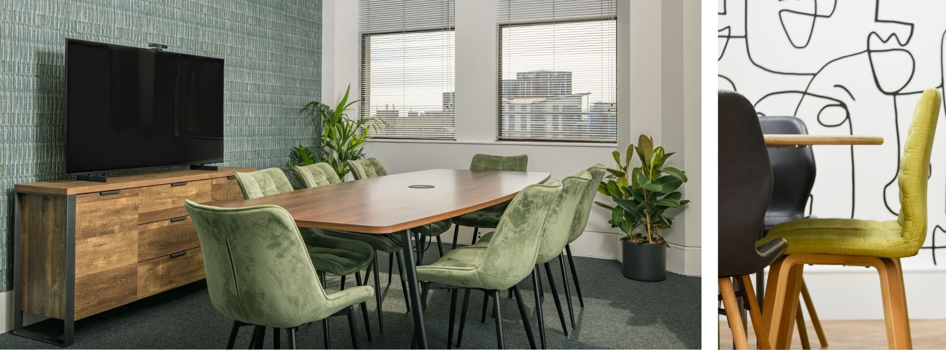 Meeting room in Woking with green table, black chairs, and modern wallpapered wall.